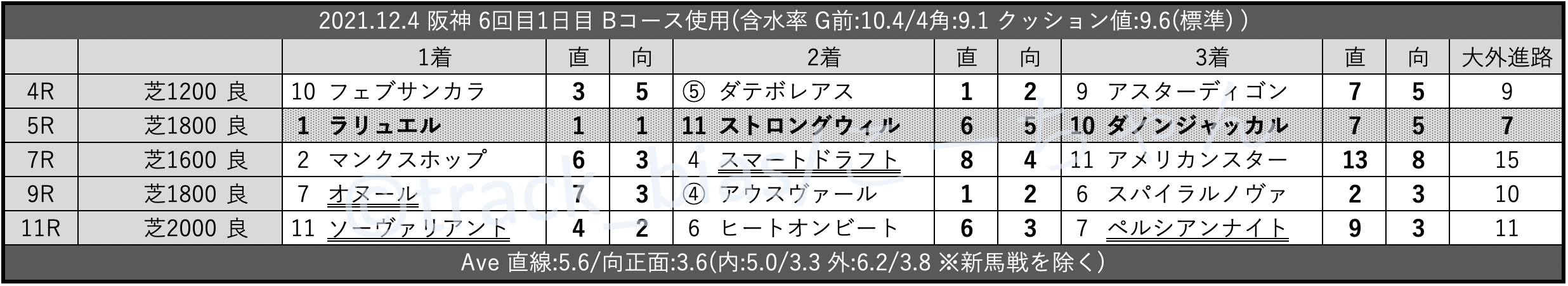 Aコース初週。2ヶ月ぶり、エアレ無しで馬場硬め。週中火~水曜72.0mmの降雨。先週土日に散水。時計は-1.5秒程度の「速い」。内外は春以来のAコースで「内有利」が強い。脚質は「先行有利… https://t.co/YZGL6lDJuX