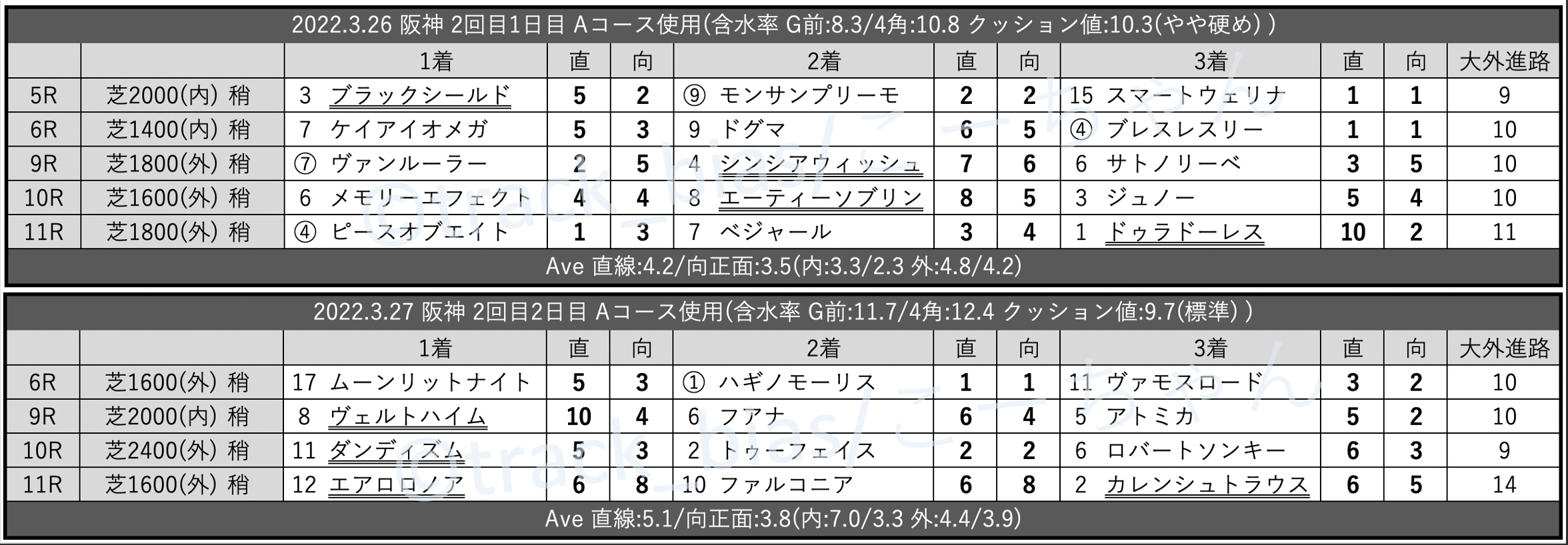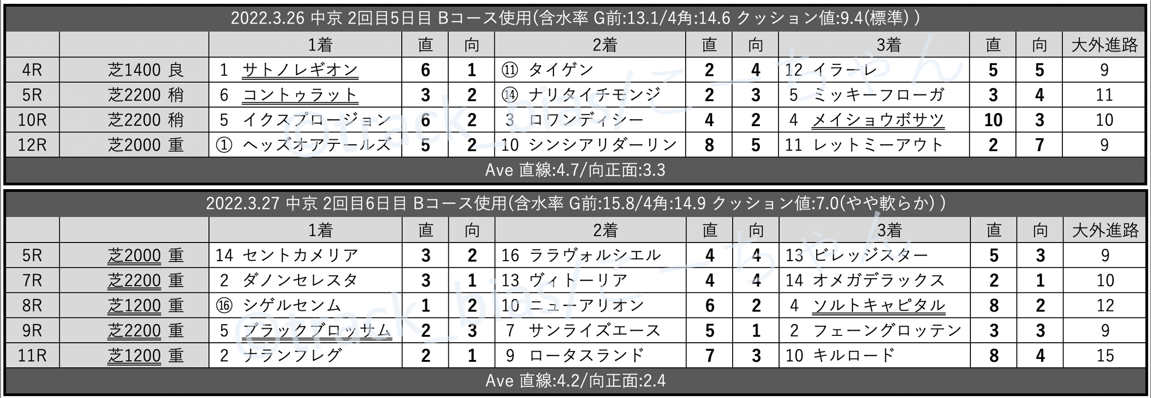 Aコース7週目。先週は火~水曜12.5mm、土~日曜13.5mmの降雨、木曜散水。2日連続稍重。時計は-0.5秒→+0.5秒/0.0秒で「平均」。内外は「内有利→内外差無」でバイアス弱い。脚… https://t.co/aTL0mFBEEN