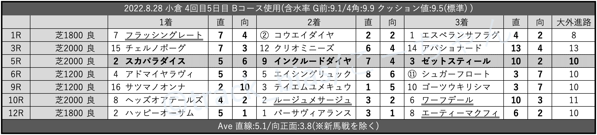 Aコース5週目。今週は水~金曜で計29.0mmの降雨。散水は月~水曜。時計は-1.0秒で「速い」。内外は「外有利」も、内をゴッソリ開けて馬群が外を走るため内枠馬も多く好走。脚質は上がり上… https://t.co/GfRBoXocQb