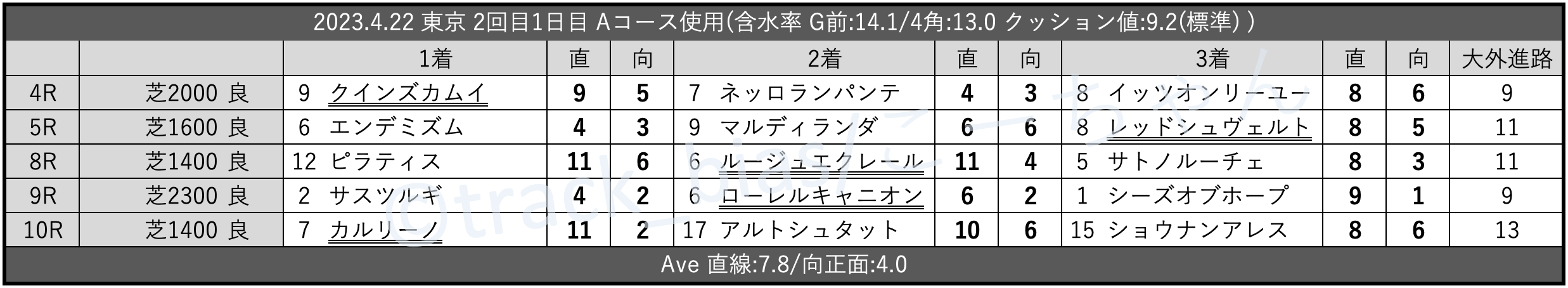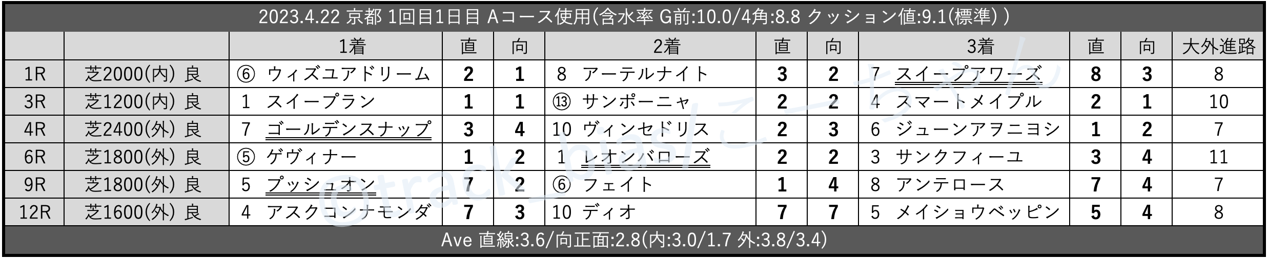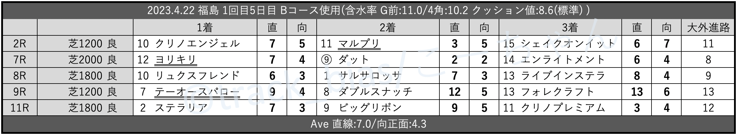 Bコース初週。降雨ゼロ。月/水~木曜散水を実施。時計が速くなって0.0秒の「平均」。それでも傷んだ芝の箇所を完全に隠せず、内外は「内外差無~外有利」。脚質は上がり上位で「差有利」も、4角… https://t.co/MiXoIkXAWB