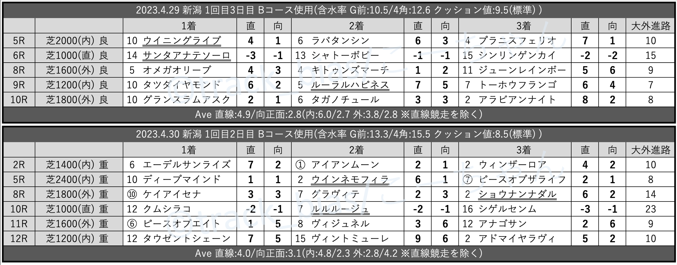 Bコース初週。約7ヶ月ぶりの開催。3月上旬エアレ実施。水曜7.0mm/日曜14.5mmの降雨。月/木曜散水。時計は土曜-0.5秒→日曜は+1.5秒で「平均→遅い」。内外は「内有利→内外… https://t.co/W1kOh0HX75